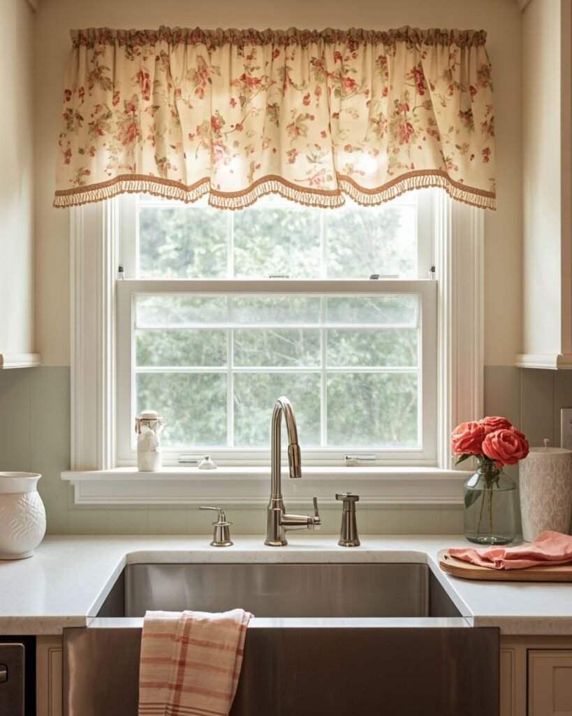 A valance is a simple way to dress up a kitchen window without adding too much fabric. It works especially well over the sink, where full curtains can sometimes feel bulky or impractical.
